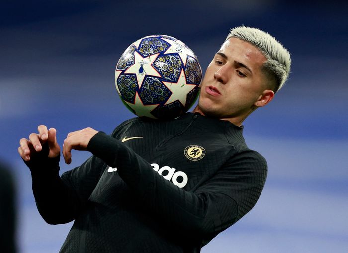 Chelseas Enzo Fernandez under oppvarmingen i Madrid onsdag kveld. Foto: Reuters