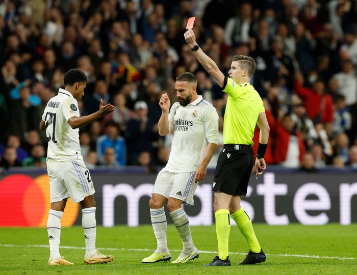 Dommer Francois Letexier viser det røde kortet til Ben Chilwell. Foto: REUTERS/Albert Gea