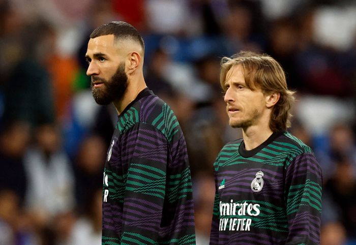 Real Madrids Karim Benzema og Luka Modric er klare til kamp. Her på oppvarmingen. Foto: Reuters