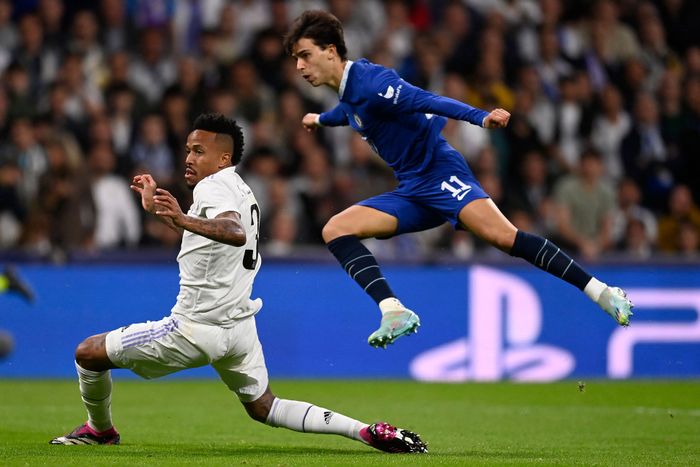 João Félix kom til avslutning helt i starten av kampen. Han er rask mot Real Madrid-forsvaret. Her er det Eder Militao som prøver å stoppe skuddet. Foto: AFP