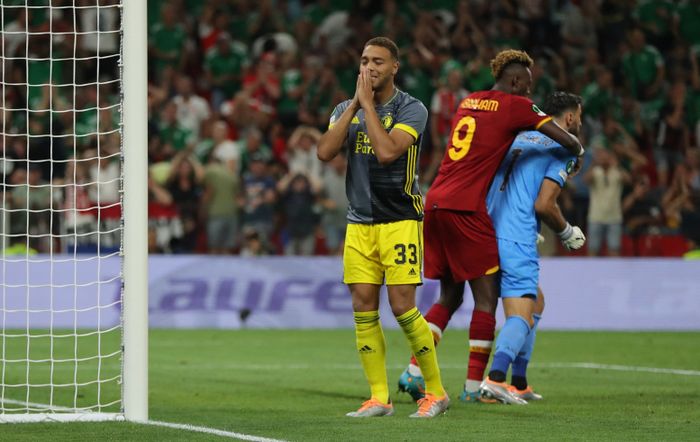 Lang ball inn i feltet til Feyenoord. Abraham vinner den første duellen og header mot Zaniolo, men sistnevnte når ikke den.