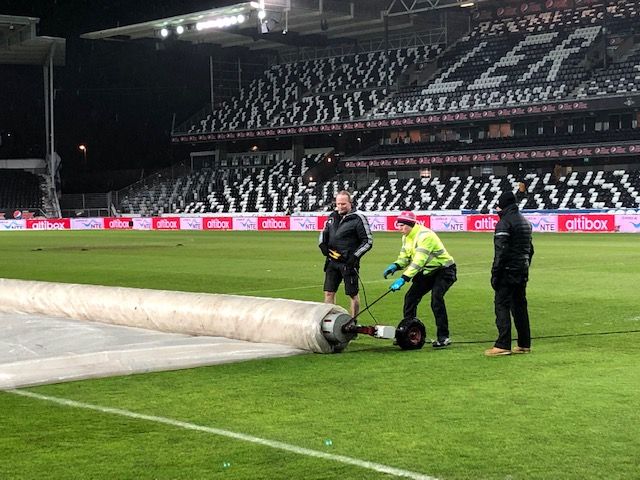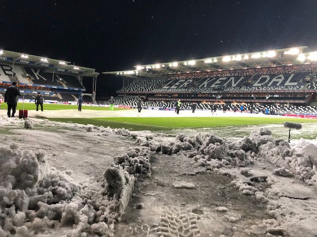 Ifølge banemester Anders Øyen skal ikke snøværet ødelegge for spilleforholdene, men det har krevd større innsats enn vanlig: – Det er den tøffeste dagen på jobben i år i hvert fall. Vi starta vel i halv åtte-tida i morges. Vi har hatt kontroll. Vi har hatt på dukene, så vi visste at det var grønt under dukene. Men det er utfordrende når snøen kommer og kommer. Matta er veldig bra, sier Øyen til VG.