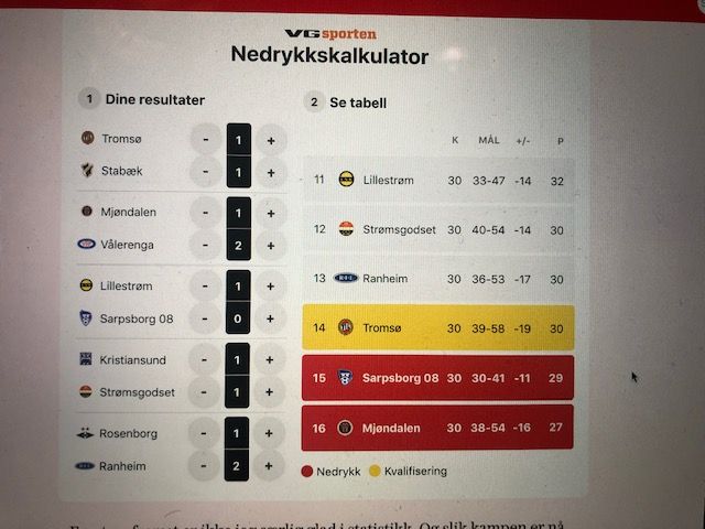 Ti minutter før avspark, satte Ranheims daglige leder Frank Lidahl, opp VGs nedrykkskalkulator der tabellen oppdateres ettersom man «gjetter» resultatet i kampene som starter klokka 18. – Oisann! 13. plass, gitt, sier Lidahl etter at Ranheim «reddet plassen».