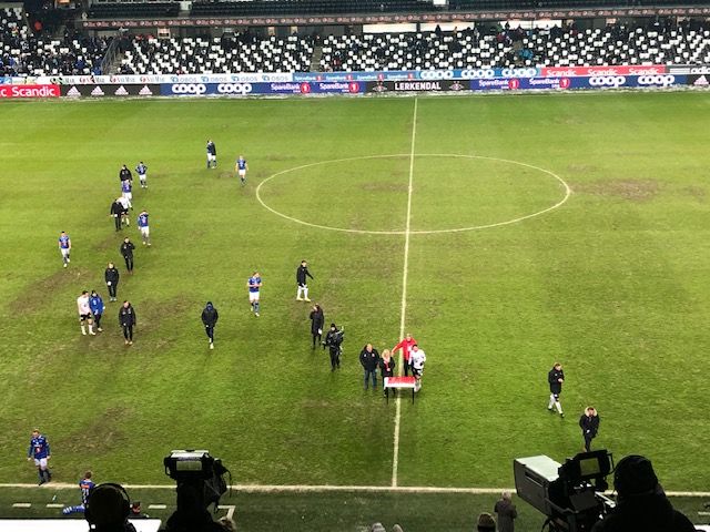 Ballen går etter hvert ut av spill, og Ranheims medisinske apparat oppsøker Bakenga. Båre gjøres til og med klar. Dette kan være alvorlig. Ser ut som venstre ankel.