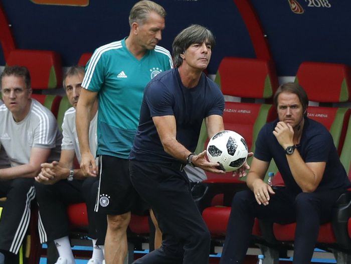 Tysklands trener Joachim Löw fanger en ball på sidelinjen for å sette raskt igang. Tyskerne har hele matchen hatt det travelt med å få ballen i spill. Alt fra utspark fra Neuer til innkast tas som regel hurtig. For det er tyskerne som må frem, de som må ha mål og for de klokka tikker mot. Foto: AP