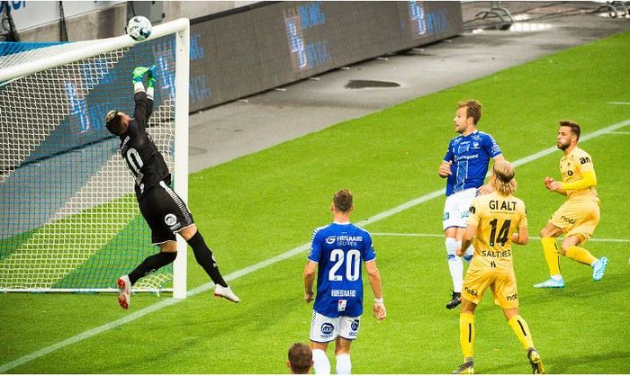 Utrolig redning! Letellier varter opp en av sesongens beste redninger! Layouni glir ned langs venstrekanten og løfter inn. Zinckernagel header fra kloss hold, hvor den franske målvakten forflytter seg raskt og slår den vekk. Der trodde nok Glimt at det skulle stå 1-0 til bortelaget!