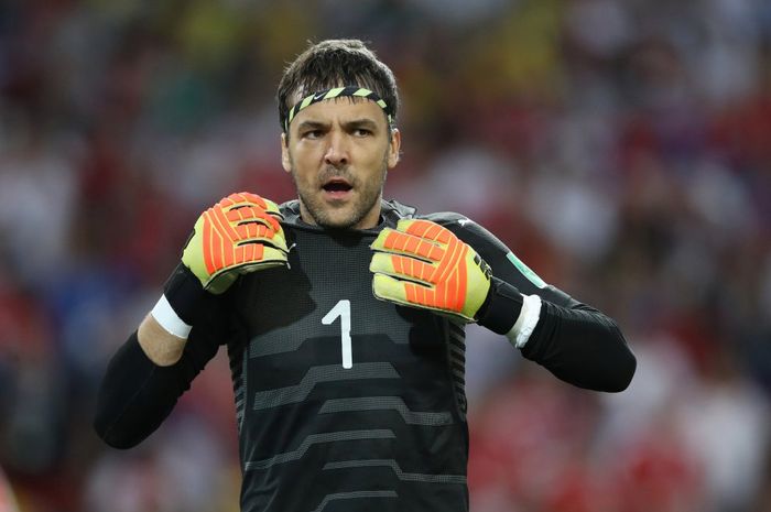 Serbias målvakt Stojkovic har valgt å spille med hårstrikk på seg i denne kampen. Gitt hvor kort hår han har, kan det neppe ha noe annen effekt enn et litt mer unikt utseende. Foto: Reuters