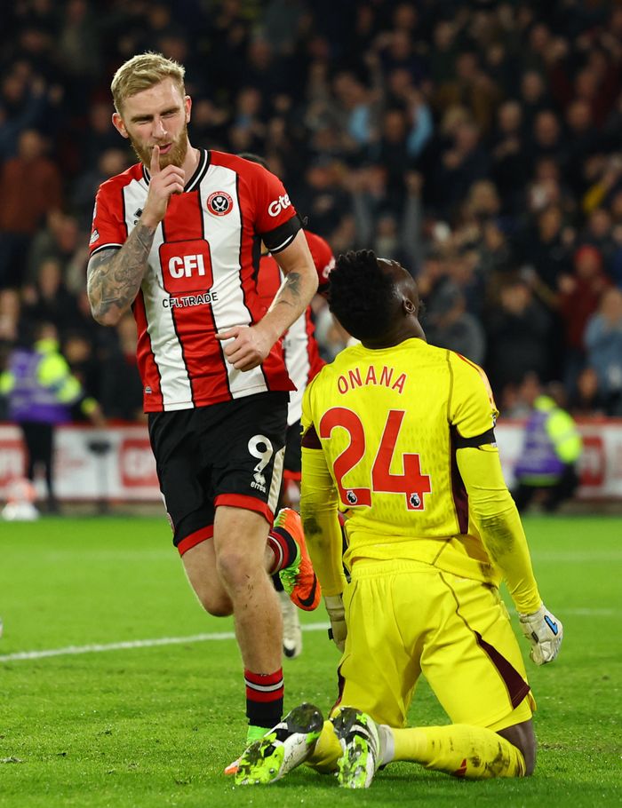 Oliver McBurnie kommer til kjempesjanse for Sheffield United. Onana redder en for svak avslutning fra spissen.