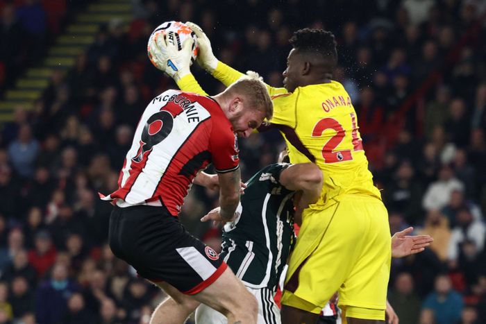 Hamer legger inn for Sheffield. Onana tar ballen. Keeperen kolliderer med Jonny Evans. Veteran-stopperen blir liggende, men reiser seg.