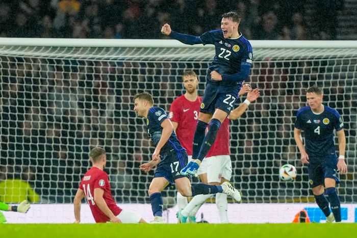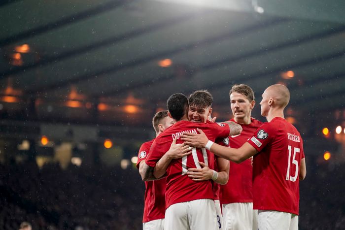 FOR EN START! Aron Dønnum scorer sitt første landslagsmål. Ryerson slår et godt innlegg fra høyrekanten og finner Strand Larsen. Spissen detter fremover og blir truffet på leggen i lufta. Den detter perfekt ned til Dønnum som legger ballen til rette, og setter inn ledelsen via et skotsk bein! Foto: NTB
