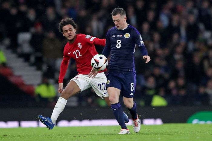 I FØRINGEN! Norge er puslete i forsvarsspillet og Skottland kriger til seg ballen ved cornerflagget. Til slutt kombinerer Armstrong og McGinn, og førstnevnte setter ballen i mål mellom beina på Sander Berge og til høyre for Selvik! Foto: Pa Photos