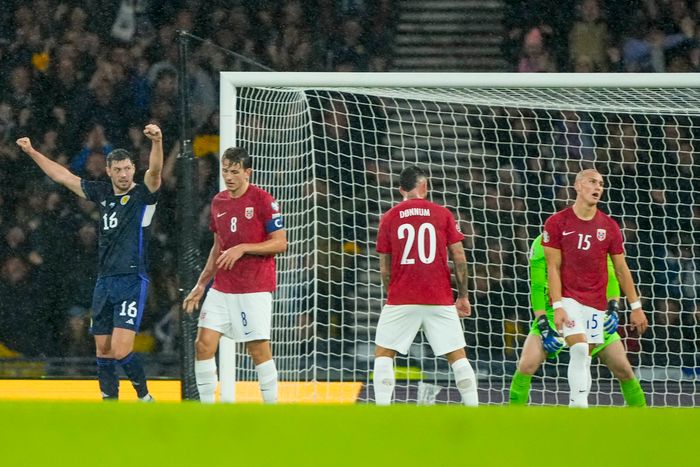 SELVMÅL! Nok en skotsk corner fra venstre og McTominay slår inn. Går forbi første stolpe, og Østigård blir truffet i låret. Den uheldige midtstopperen er sist på ballen når den endrer retning og går inn bak Selvik! Foto: NTB