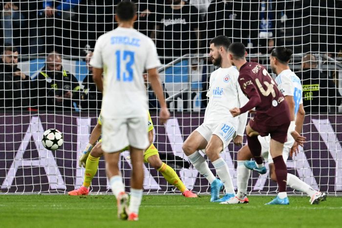 Og så sitter den for Manchester City! Et vedvarende trykk mot hjemmelagets mål ender i en scoring. Fint volleyskudd, men går via en forsvarer og setter hjemmekeeperen ut av spill. Foto: Joe Klamar / AFP