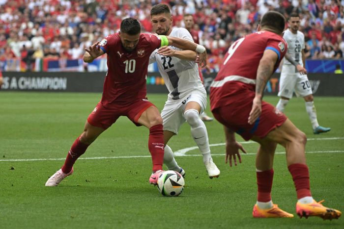 Dusan Tadic danser litt rundt ute på venstrekanten før han slipper til Mladenovic. Innlegget hans blir litt for upresist og Slovenia klarerer.