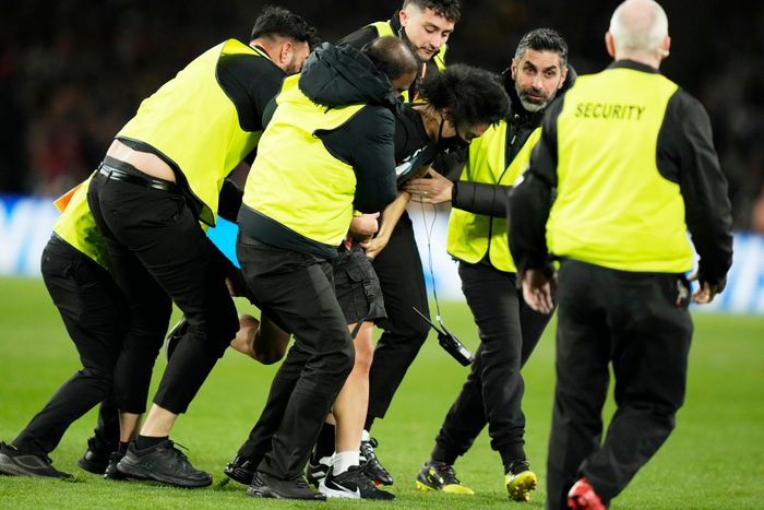 En banestormer ble raskt stanset av sikkerhetspersonellet. På ryggen hans sto det "Free Ukraine".