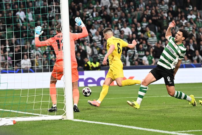 Sporting scorer med en gang. De fortsetter der de slapp før ekstraomgangene. Sporting spiller fint opp på venstre. Etter litt tilfeldigheter havner ballen hos Trincao som finner Araujo. Backen får sneket ballen inn ved venstre stolpe. Haikin får en hanske på den, men ikke nok til å avverge.