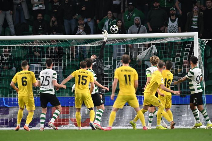 Så vinner Sporting et frispark på hjørnet av 16-meteren.