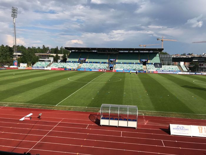 Stabæk-spillerne er fremdeles har nå kommet ut på gresset, men en drøy halvtime før kampen sparkes i gang har Mjøndalen ennå ikke kommet ut i sommervarmen.