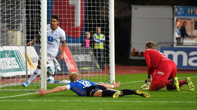 Den er ferdig scoret. Igjen er det Haugen som er fri på kanten. Innlegget går forbi alt og alle, og på bakerste stolpe kan Ohi sette ballen enkelt i tomt mål.