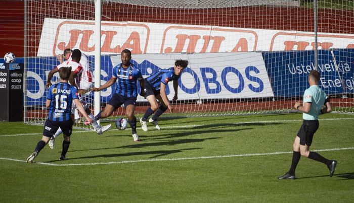 Så blir det farlig! Smelles hardt inn og Normann Hansen forsøker å flikke den videre. Går over tverrliggeren.