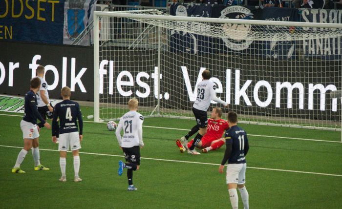 Der skal det være 0-2! Men Vikstøl setter ballen i stolpen fra fem meter!