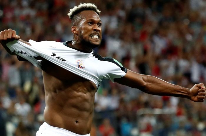 Kendall Waston - mannen som kom inn på alget til denne kampen - stiger til værs og stanger inn utligningen for Costa Rica! Og både spillere og fans går amok! Et fantastisk hodestøt! Foto: Reuters