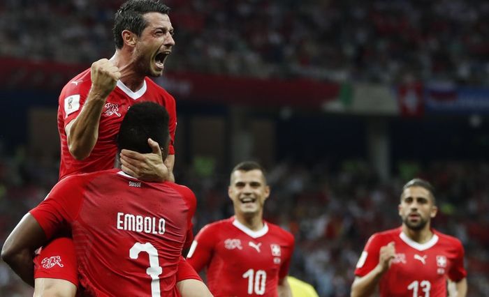 Sveits tar ledelsen, mot spillets gang! Kommer til innlegg fra høyre, Embolo vinner duellen og header ballen tilbake i feltet. Der venter Dzemaili, som hamrer ballen i mål!Foto: AFP.