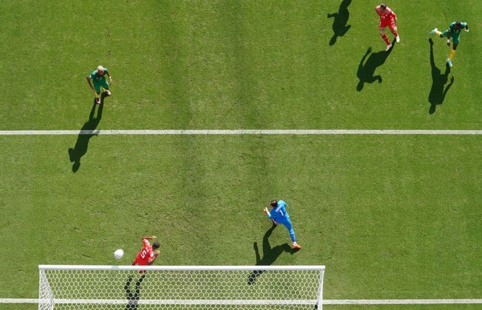 Sveits får en corner. Rieder med et innlegg som blir avklart til corner rett ved stolpen til Kamerun.