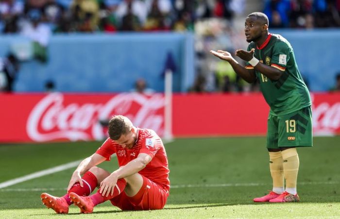 Kamerun får en siste mulighet på et frispark. Anguissa legges ned. Det er vel 30 meter til mål.
