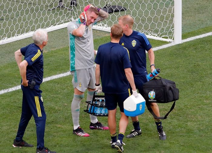 Robin Olsen ligger nede med en skade nå. Han kommer seg opp og fortsetter, men kan bli et bytte her.