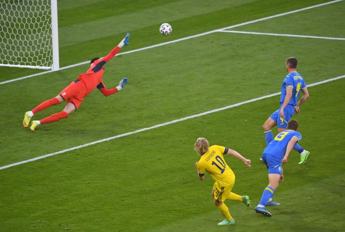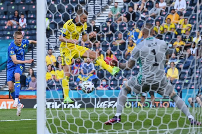 Nei, nei, nei, Sverige! De slipper altså inn på overtid i den andre ekstraomgangen. Innlegget fra venstre er strøkent, og der har Dovbyk sneket seg inn mellom de to stopperne.