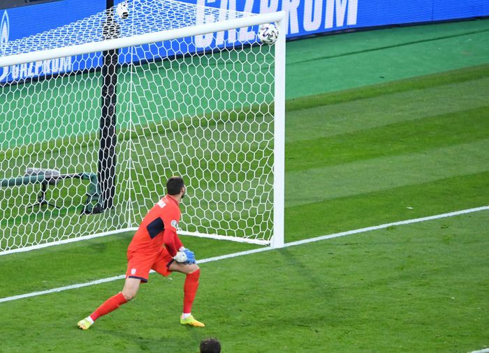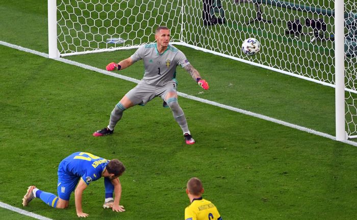 Så kommer scoringen! Ukraina vender spillet fint og Jarmolenko legger inn med utsiden på tvers av feltet. Zintsjenko brenner til på halv volley og den klarer ikke Olsen å stoppe! Keeperen får en hånd på ballen, men skuddet er knallhardt og Ukraina tar ledelsen. Foto: Paul ELLIS / POOL / AFP
