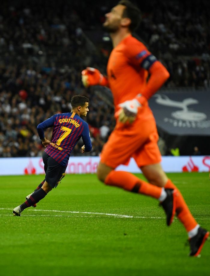 90 sekunder tar det før Barcelona tar ledelsen. Uff LIoris. For en tabbe. En ball fra Messi spilles bak back Trippier. LIoris finner ut at han har noe der ute å gjøre, men det har han overhodet ikke. Han er fullstendig på bærtur. Alba triller til Coutinho som setter ballen enkelt i mål.