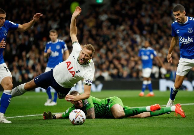 TOTTENHAM FÅR STRAFFE! Pickford feller Kane etter først å ha gitt en svak retur på et skudd fra Doherty.