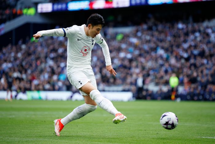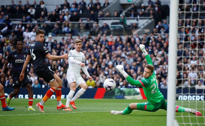 Har du sett for noen sjanser?! Helt utrolig at det ikke står 1-1! Spurs bryter på Lutons halvdel og Son spilles gjennom. Kapteinen runder keeper før han setter ballen først i venstre stolpe, og deretter høyre stolpe! Så får Sarr muligheten, men skuddet reddes på streken av Luton-stopper Mengi! Foto: Reuters