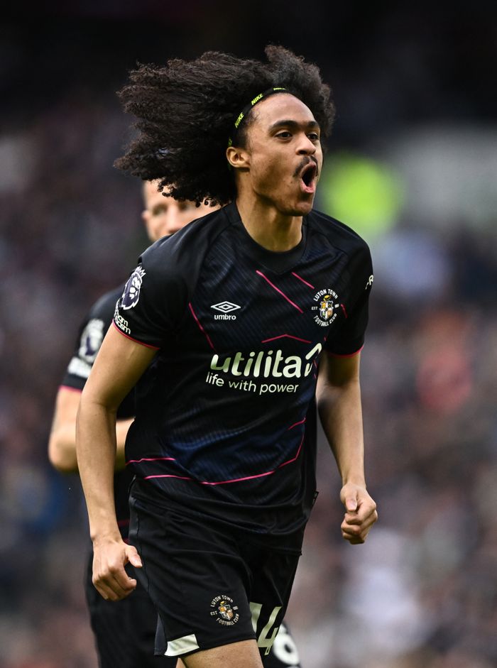 Frispark til Luton og Berry. Udogie er for sent inne i taklingen, men blir selv liggende på gresset.