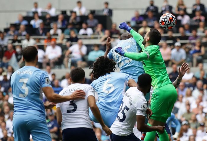 NESTEN! Lloris kommer ut og bommer. Fernandinho får dermed et mer eller mindre åpent mål å heade mot. Stanger den utenfor! Foto: Reuters.