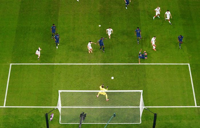 Merkelig at Mandanda bokser unna ballen når det er ingen Tunisia-spillere rundt ham, men Frankrike får tak på ballen til slutt. Likevel rart å se. Det var ingen rundt.
