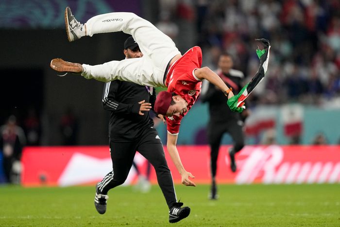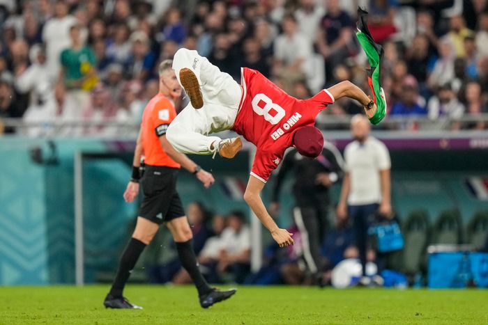 Dette var banestormeren med Palestina-flagget. Han kjørte en «araber-flikkflakk» som det så flott heter. Foto: AP.