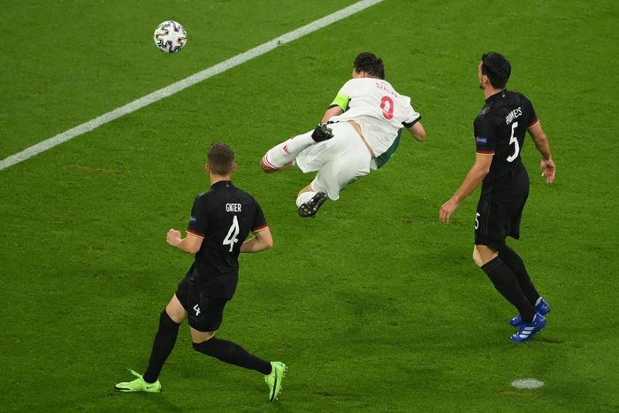 Ungarn ryster Tyskland! Strålende innlegg fra høyre. Adam Szalai stuper frem og stanger ungarerne i føringen! Det er svak markering av Mats Hummels og Matthias Ginter i midtforsvaret. Szalai stuper frem og header ballen i mål! Foto: AFP