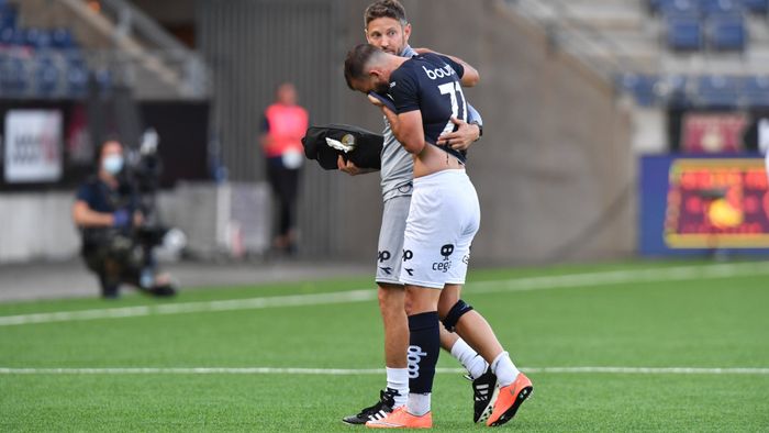 Kommer seg på beina igjen, Viking-kapteinen. Men tv-bildene viser at han har et ganske stort kutt midt på høyre legg, rett over leggskinnet.
