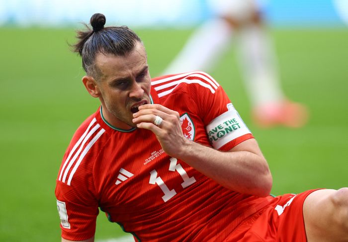 Bale prøver seg fra om lag 30 meter, men får et svært dårlig treff og da går ballen i slow motion inn i klypene på Hosseini.