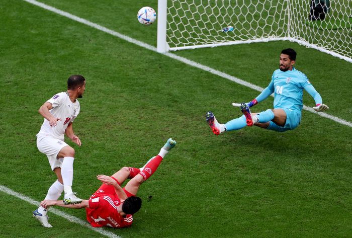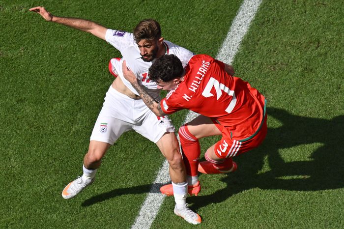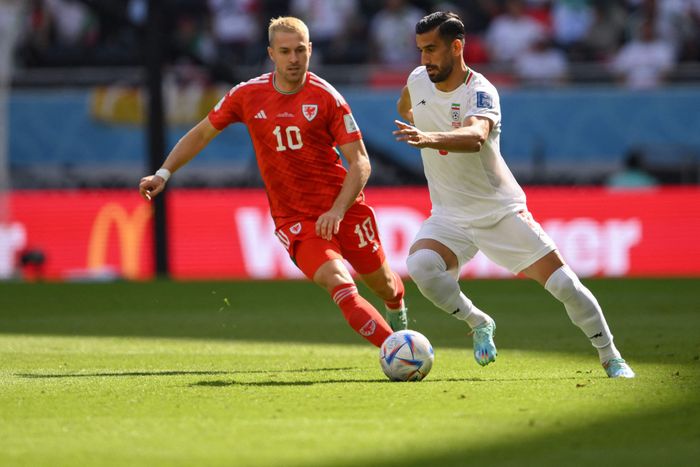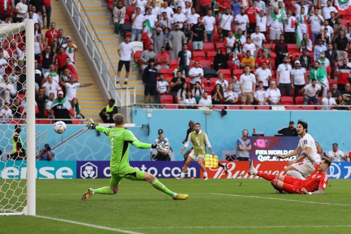 Taremi får en fin mulighet når Wales-forsvaret blir ryggende, men skuddet til Iran-spissen blokkeres ut til corner.