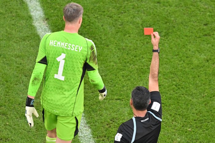 Hennessey må rusle av banen. Krangler ikke på den avgjørelsen, den walisiske keeperen.