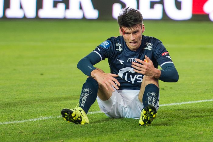 Moore blir liggende etter sjansen. Reprisen viser at spissen får en fot i ansiktet etter å ha avsluttet. Får tilsyn nå, spissen.