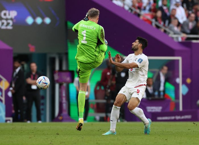 Iran får en overgangsmulighet, men langpasningen mot Azmoun går inn til Hennessey.