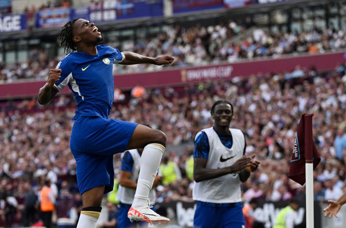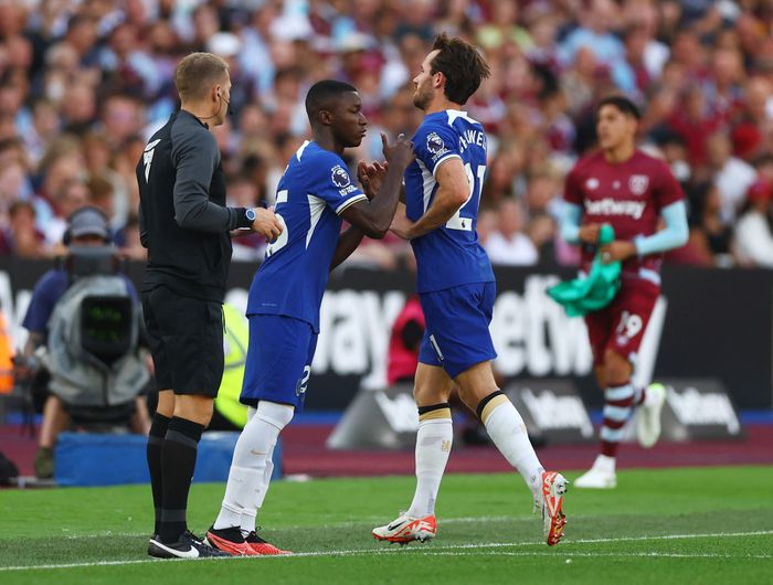 Chelsea med et lovende angrep før målscorer Chukwuemeka må strekke ut beina for å nå den siste pasningen. West Ham får frispark ved egen 16-meter.