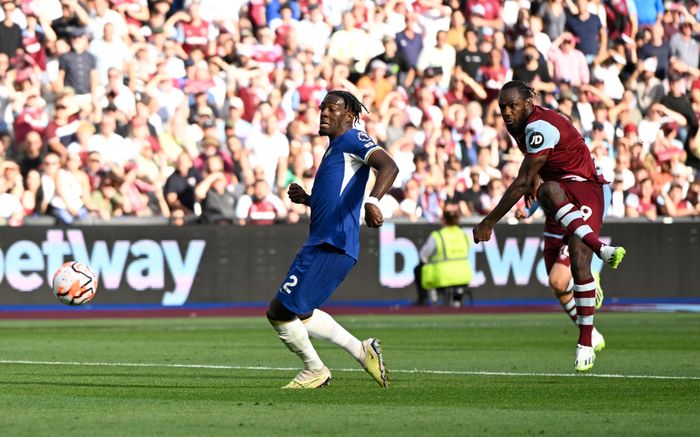 SENDER WEST HAM I LEDELSEN! Ward-Prowse slår en glimrende bakromsball mot Antonio, som bruker musklene sine for alt det er verdt. Holder Disasi unna, og dunker til like ved 16-meterstreken. Skudet suser bak Sanchez og i mål! Foto: Reuters