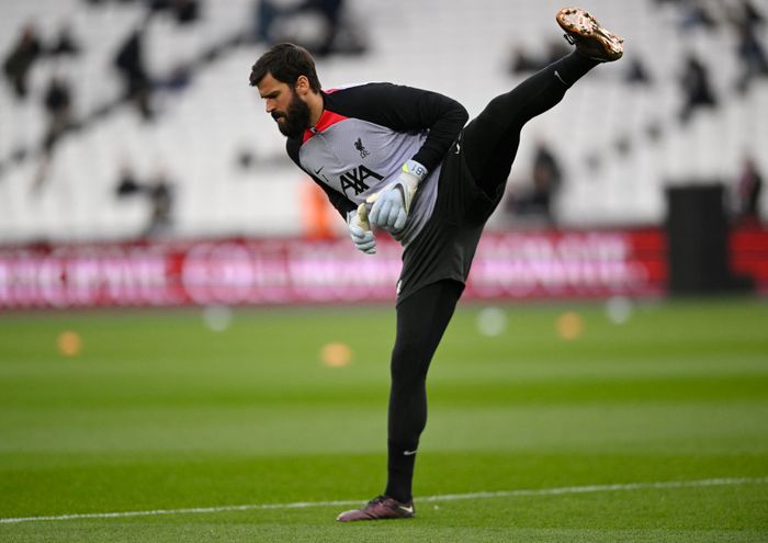 Til alle menn og kvinner som venter på kamp, prøv dette. Eventuelt ikke. Liverpools keeper Alisson Becker under oppvarming. Foto: Reuters