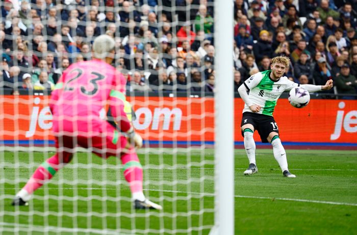 Elliott svinger et godt innlegg inn mot Gravenberch på bakerste. Midtbanemannen mye tid å stille inn siktet på, men avslutningen er altfor svak. Femmeter til West Ham.